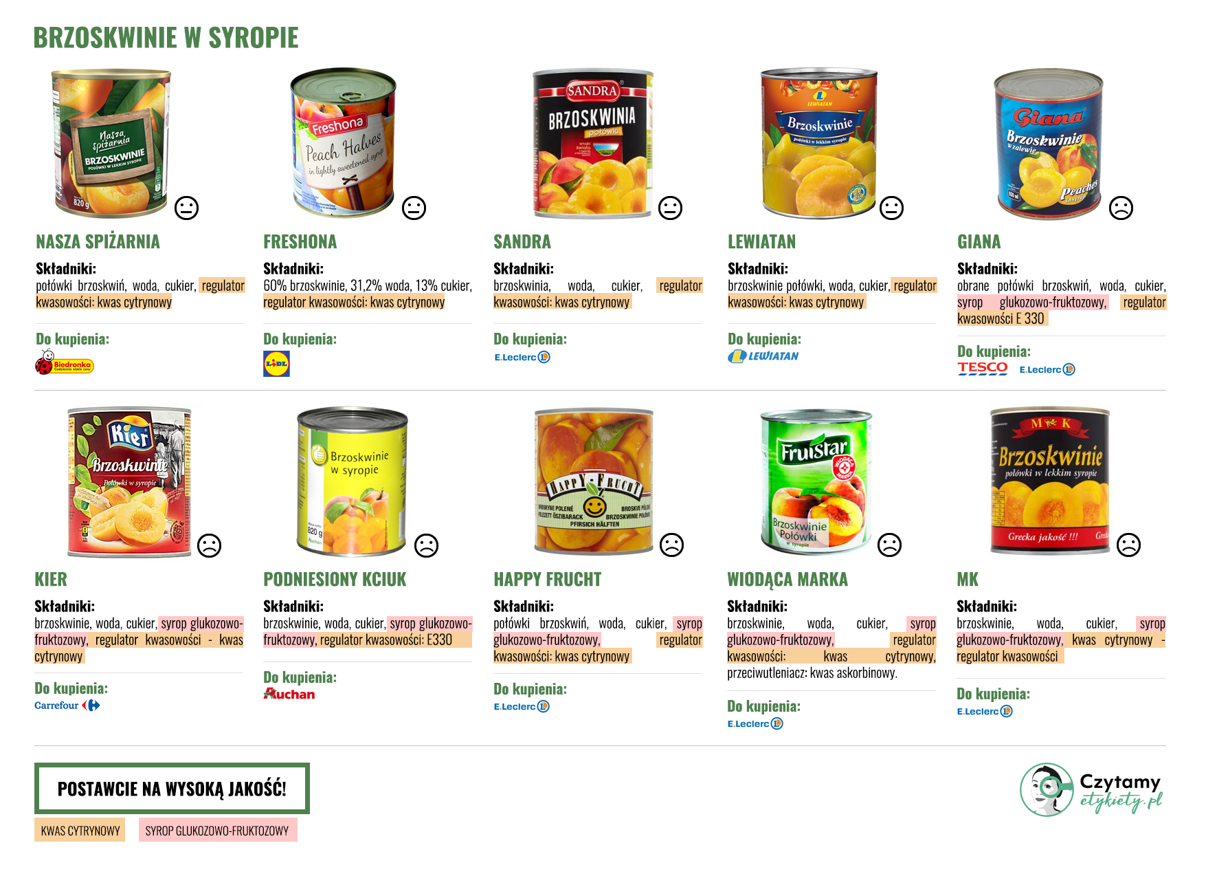 • neutralna dla poprawnych składów, czyli dla brzoskwiń z kwasem cytrynowym, ale bez syropu glukozowo-fruktozowego. Można je śmiało kupować.