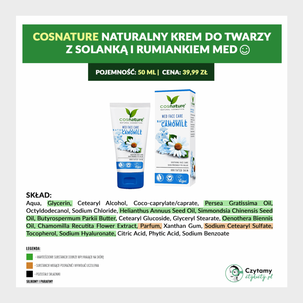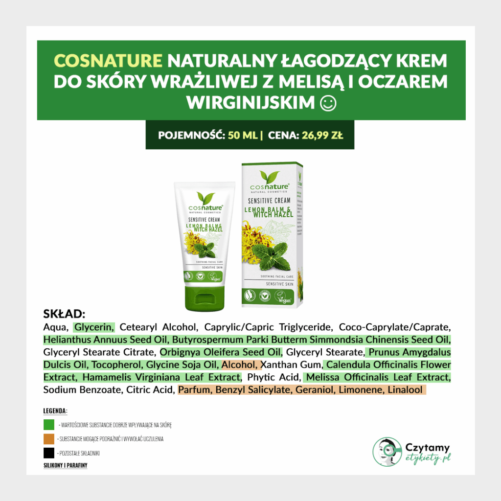 Cosnature to idealny przykład na to, że naturalna pielęgnacja cery problematycznej nie musi być droga i nie wymaga kompromisów – w składzie nie znajdziemy silikonów czy parafiny, bazą produktów są naturalne oleje (w tym i te lubiane przez nas – słonecznikowy , jojoba, masło shea), antyoksydanty i naturalne ekstrakty (melisa, oczar wirgilijski, zielona herbata, rumianek).