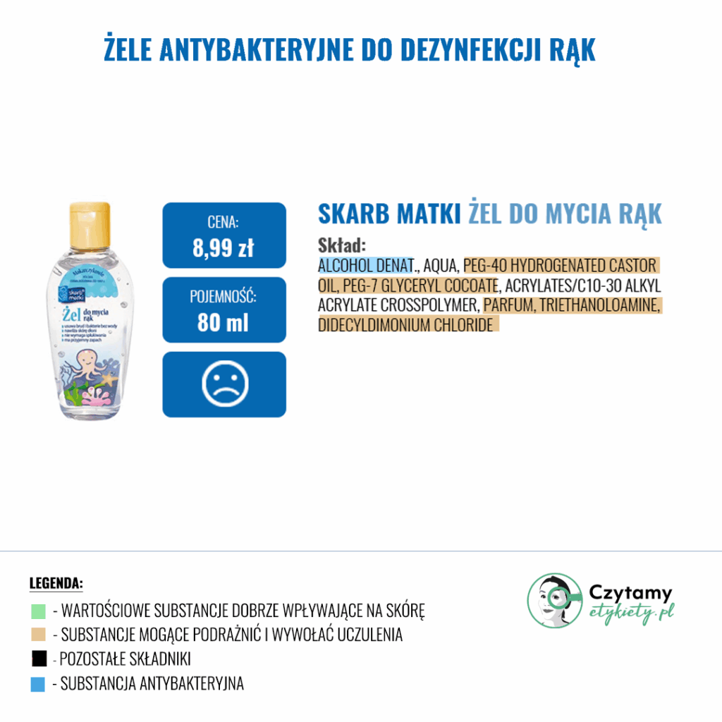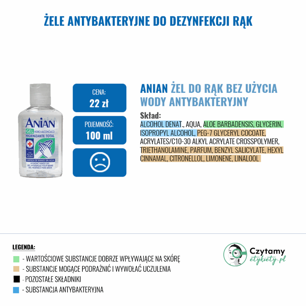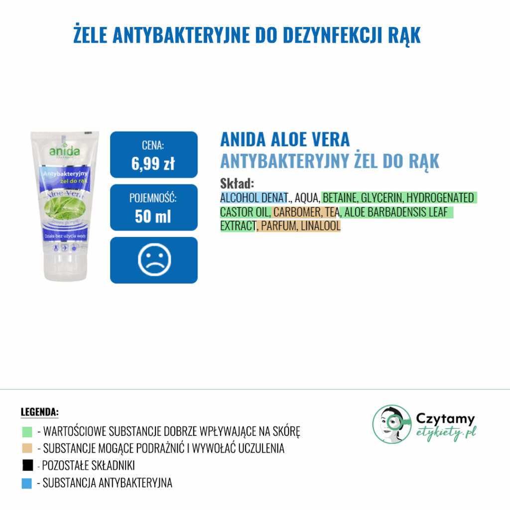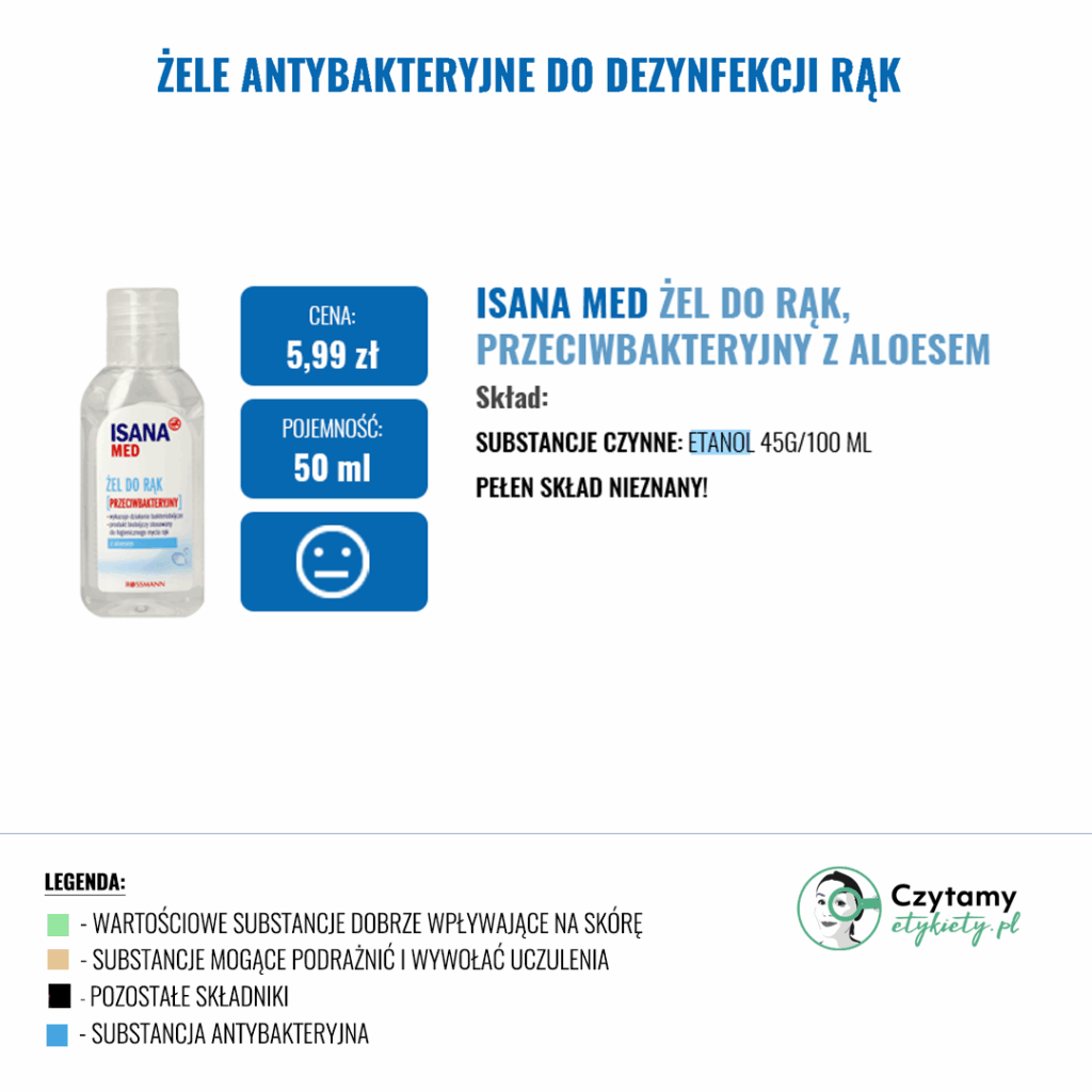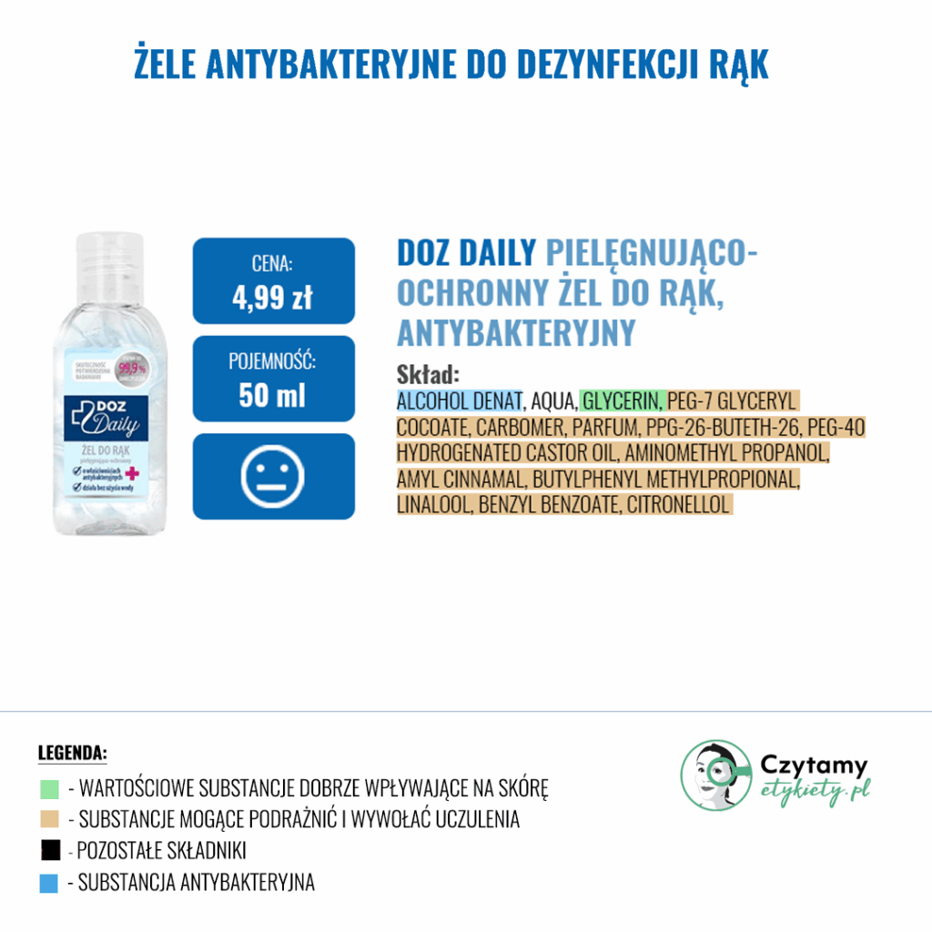 W gotowych żelach często znajdziemy substancje nawilżające, które mają zapobiegać uczuciu ściągnięcia skóry (Betaina, Gliceryna, Aloes) oraz inne substancje zwiększające skuteczność dezynfekcji np. Disodium EDTA. Zdecydowanie warto unikać produktów w Triethanolamine ze względu na jej potencjalnie drażniące działanie i prawdopodobieństwo tworzenia się szkodiwych nitrozoamin w sprzyjających warunkach.