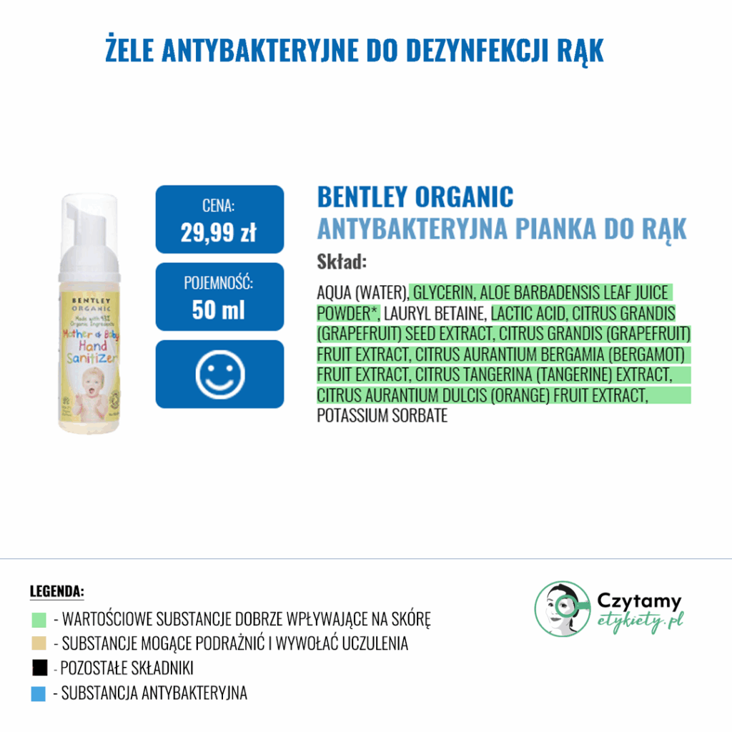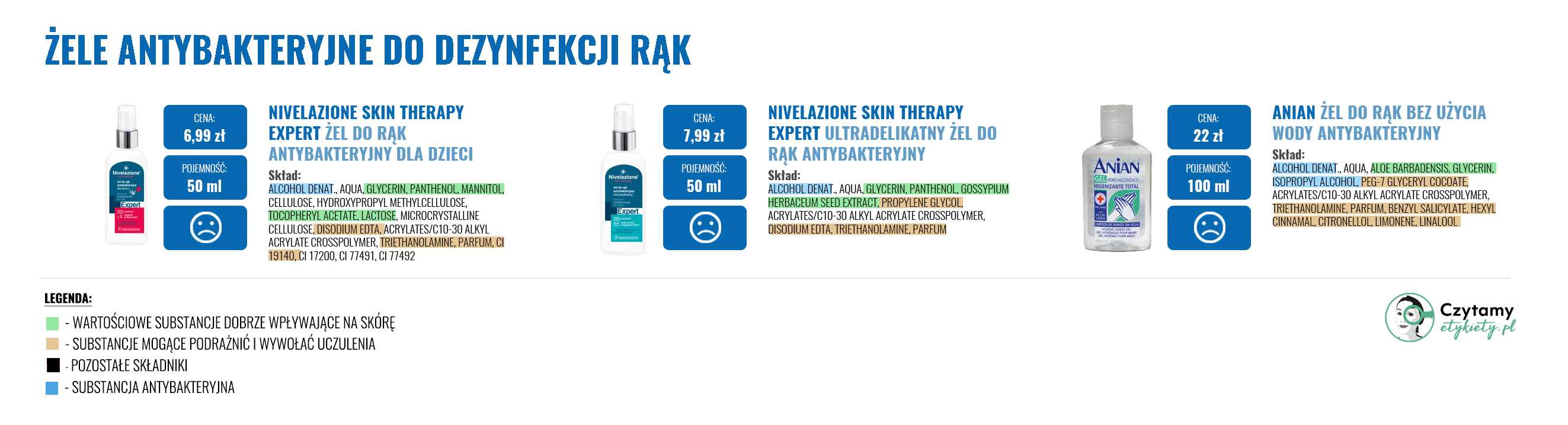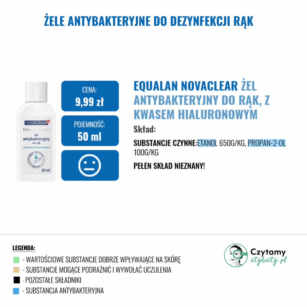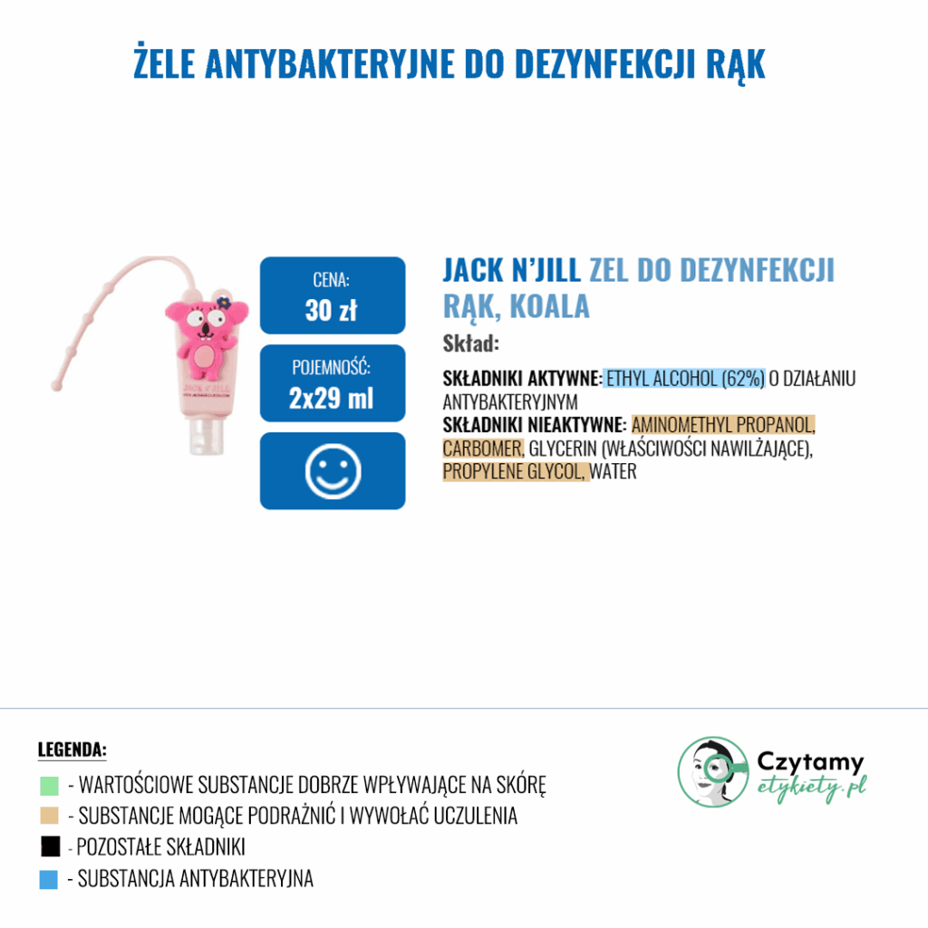 W gotowych żelach często znajdziemy substancje nawilżające, które mają zapobiegać uczuciu ściągnięcia skóry (Betaina, Gliceryna, Aloes) oraz inne substancje zwiększające skuteczność dezynfekcji np. Disodium EDTA. Zdecydowanie warto unikać produktów w Triethanolamine ze względu na jej potencjalnie drażniące działanie i prawdopodobieństwo tworzenia się szkodiwych nitrozoamin w sprzyjających warunkach.